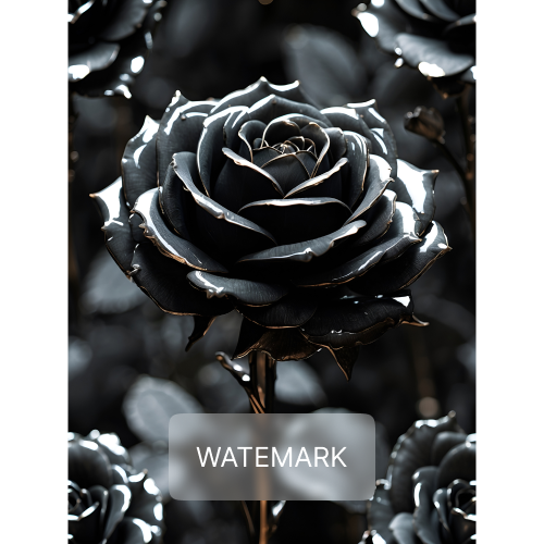 A striking sculpture of a black rose blooms in solitude, its petals edged with silver light.