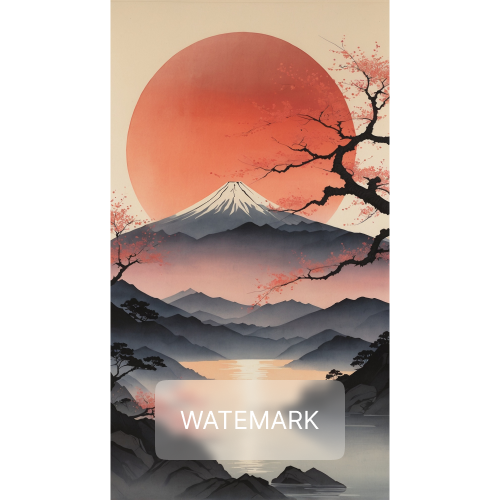 A serene panorama of Mount Fuji, enveloped in the warm glow of a large red sun.