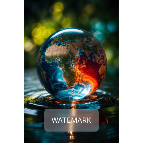 A glass globe representing Earth rests on a reflective surface, illuminated by a tapestry of fiery and aquatic colors.