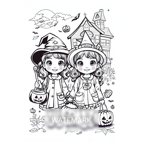 Dressed in enchanting witch costumes, two cheerful young girls stand ready for a night of trick-or-treating.